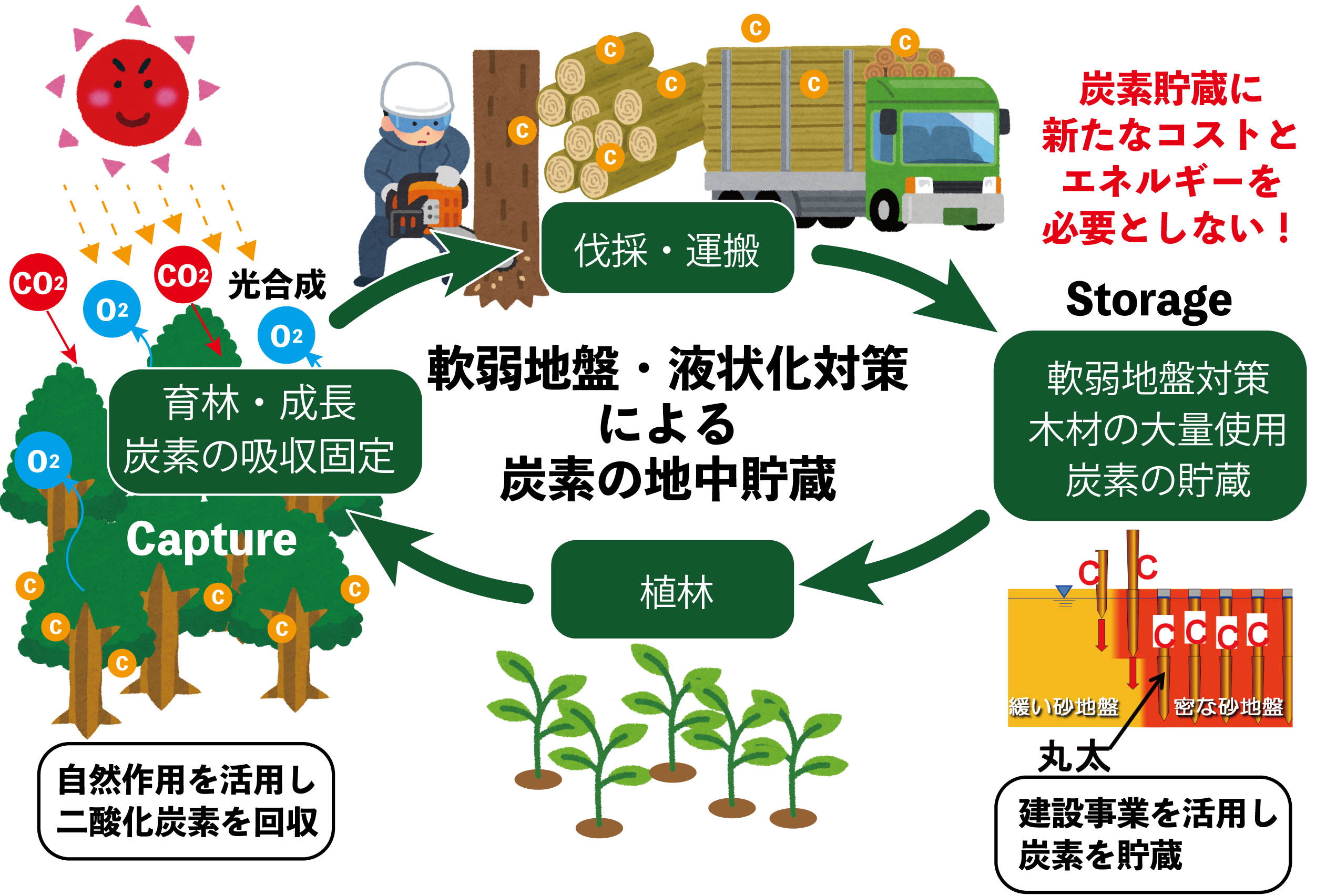 現在木材は建築材料や家具などに使われていますが,木材の軟弱地盤対策などへの地中活用は,木材を大量に,長期間,かつ,安定的に地中に設置することができるので,正に気候変動を生じさせた逆の方向へ進む,単純かつ確実な方法です.