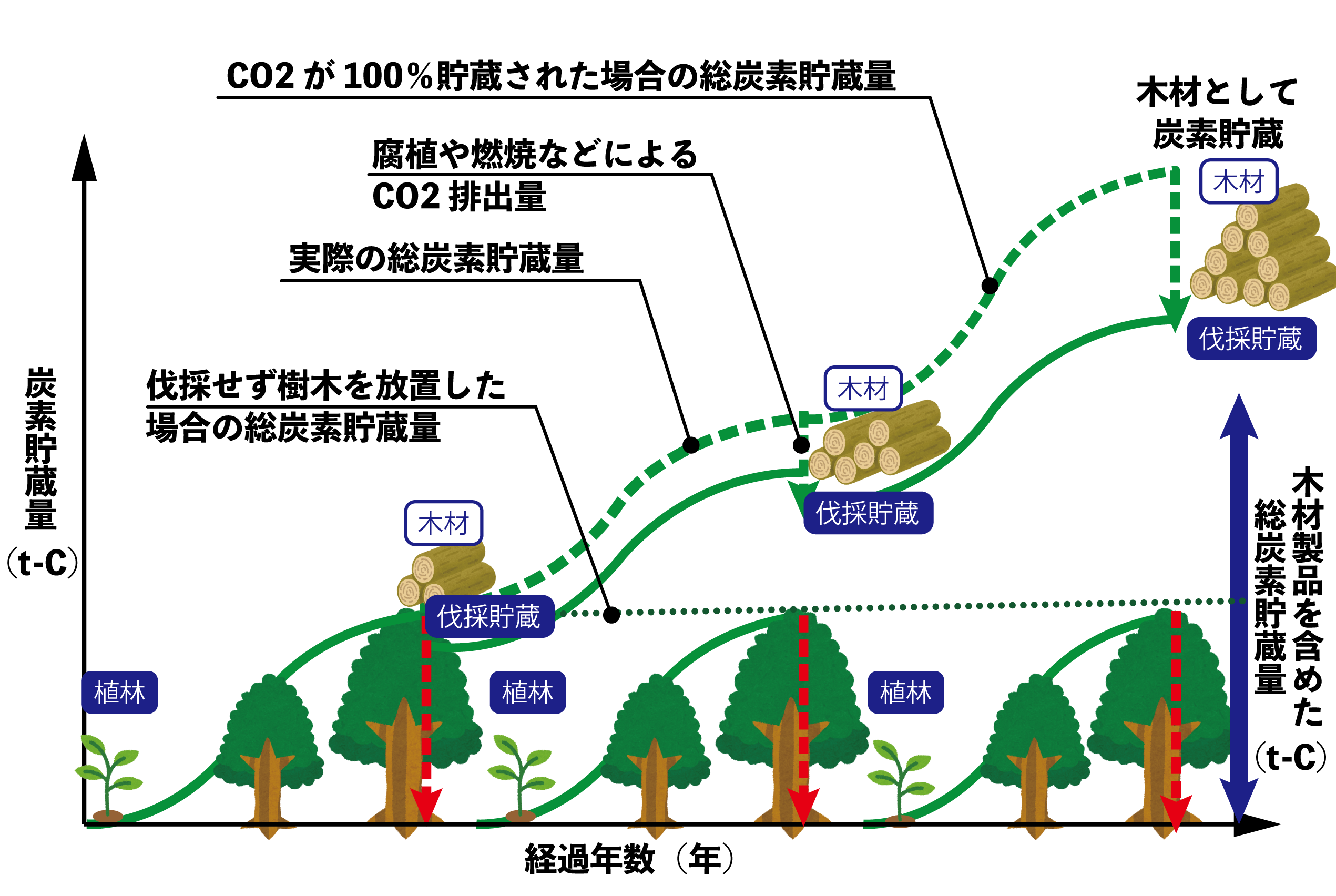 成長した樹木は.伐採して丸太を始めとした木材製品(HWP:Harvested Wood Products)となっても炭素を木材として固定したままです.伐採した土地に植林が行われ,再び樹木が成長すれば,その分新たに二酸化炭素を大気中から削減させたことになります.HWPと樹木の総量の増加は,大気から吸収され固定化した炭素量の増加なので,その分純粋に大気から二酸化炭素を減少させたことになります.樹木やHWPの総量を増やす施策が,大気中の二酸化炭素濃度を減らす有効な方法なのです