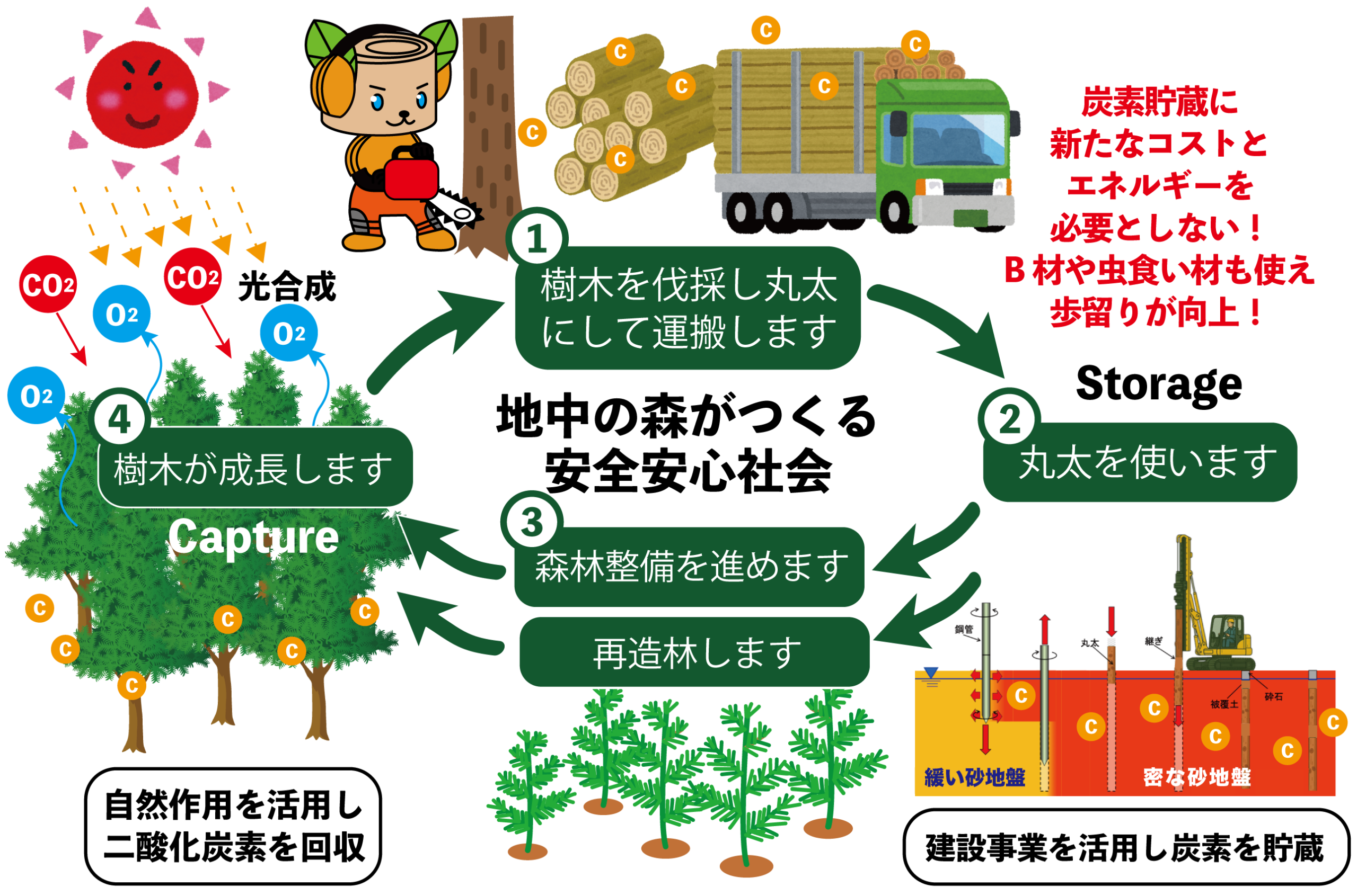 例えば,丸太を地中に打設するには,建設工事用の重機を用います.このため,工事をすることにより二酸化炭素を排出します.しかしながら,工事に用いた木材に固定されている炭素量(二酸化炭素換算で)は,建設工事による排出量の十倍以上に大きいことが確認されてます.したがって,工事をすればするほど,二酸化炭素を排出するのではなく,大気から二酸化炭素を削減していくことになります.
